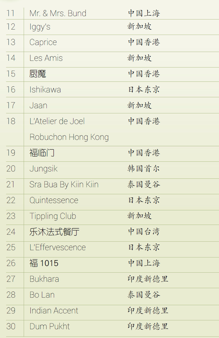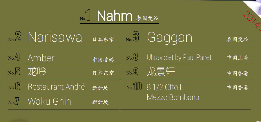 “今年一共有10家新餐廳打入‘亞洲50佳餐廳榜’之列。這體現了亞洲餐飲業充滿創意、多元及持續轉變的一面。”“亞洲50佳餐廳榜”總編輯威廉·杜魯(William Drew)說。
