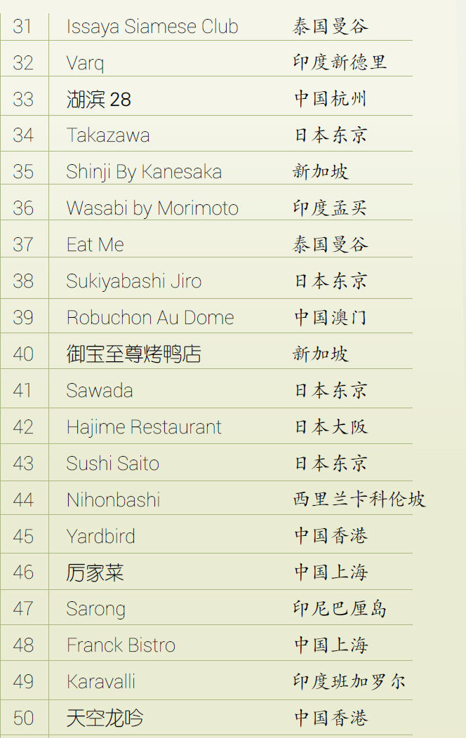 令人遺憾的是,盡管中國餐廳占據了榜單近三分之一,卻沒有一家來自北京。排名第48的Franck Bistro來自上海,排名第33的湖濱28位于杭州,而排在第9位的龍景軒和第39位的Robuchon Au Dome,則分別來自香港和澳門。在新入榜餐廳中,也有三家中國餐廳,分別是位于臺中的樂沐法式餐廳(第24名)和位于香港會議中心的天空龍吟(第50名)。看起來最能體現皇城特色的厲家菜,其上榜的依然是位于上海的餐廳,排在第46位。