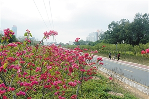 5號綠道全長約13公里,起于東湖公園南門,終點是橫瀝口。在南門借一輛公共自行車,一頭栽進山與水的懷抱。綠道兩旁最多怒放的鮮花,簕杜鵑、四季桂、馬櫻丹、牽牛花、黃風鈴爭奇斗艷。一走上綠道,浮動的暗香讓人不禁陶醉。綠道并不是全程的粒石路面,途中間或3米寬的木質棧道,可以憑欄眺望水庫的山水一色。微風拂來,雜草隨風舞動,鳥兒的啼叫夾雜在陣陣的松濤聲中,讓人忘卻山外的喧囂和忙碌。