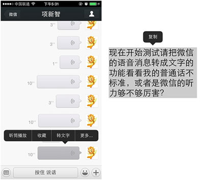 “現在開始測試新版微信的語音消息轉成文字的功能,看看我的普通話標不標準,或者說微信的聽力夠不夠厲害。”