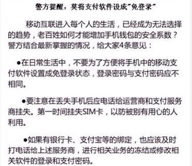 移動互聯進入每個人的生活,已經成為無法選擇的趨勢,如何才能增加手機錢包的安全系數?①不要移動支付軟件設成免登錄狀態;②丟失手機第一時間掛失SIM;③凍結卡相關業務或修改軟件登錄、支付密碼;④安裝正規手機防盜軟件。