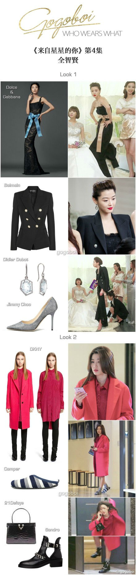 第二集里千頌伊為了親民,上學時打扮得客氣些了。不過看行頭就知道,女神的親民是裝的,因為“只有社區班長才要親民”。美容室那套撕B裝最氣派,Lanvin大衣配印花裙,袖子瀟灑地挽起來,走路帶風,氣勢上就贏了。另外,那雙相當于灰姑娘水晶鞋的Jimmy Choo也登場了。