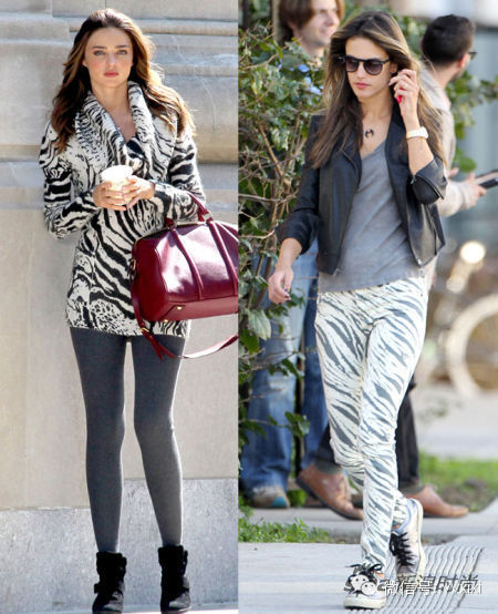 穿著一件斑馬紋的外套上街,保證你的回頭率會非常高。米蘭達可兒這件斑馬紋的大領毛衣,搭配LV經典深紅色手提包,“辣媽”果然不同凡響。而超模Alessandra Ambrosio則采用黑白條紋的“萬金油”穿法,用夾克搭配灰色打底衫與斑馬紋長褲出鏡,非常干練。