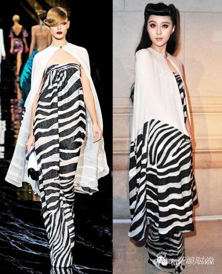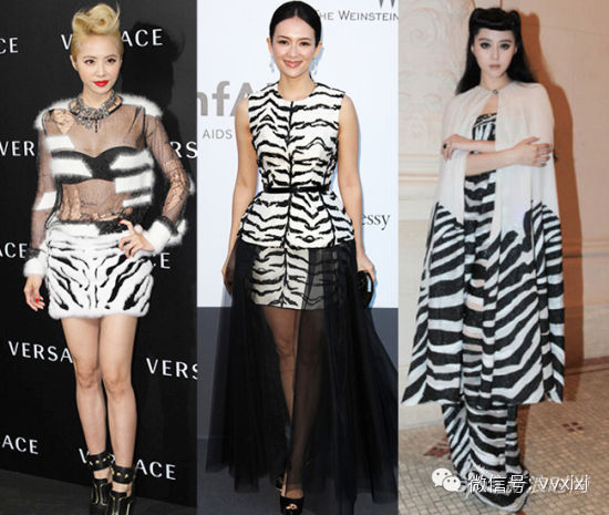 在Party中嘗試穿著斑馬紋再合適不過了,輕松又舒適。名媛孫蕓蕓這件絲綢的斑馬紋吊帶短裙,將絲綢的“柔”和斑馬紋的“野”相結合,打破傳統女性的性感尺度。相比之下霍思燕的這身Gucci上衣的透視元素與不規則的黑白條紋的相對比,頗有活潑、動態的感覺。