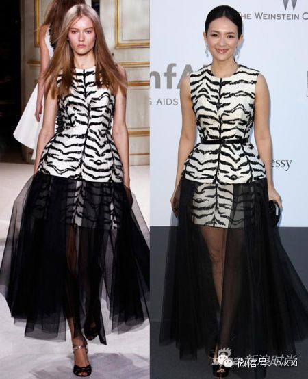 章子怡身穿Giambattista Valli 2013春夏高定系列亮相某活動現場,無袖連衣裙設計與斑馬紋相配凸顯女王范的性感霸氣,半身黑色紗裙搭配黑色皮腰帶更加拉伸下身比例,增加層次感,凸顯性感長腿。