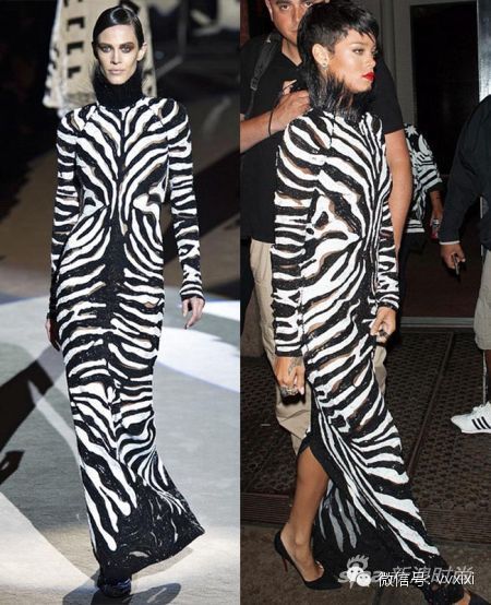 蕾哈娜Rihanna這身斑馬修身長裙來自Tom Ford2013春夏系列,大面積的黑白色調拼接成的斑馬紋理展現了迷人的印花風情。雪紡與斑馬紋混搭,輕盈雪紡囂張之余亦不失女性柔美氣質。
